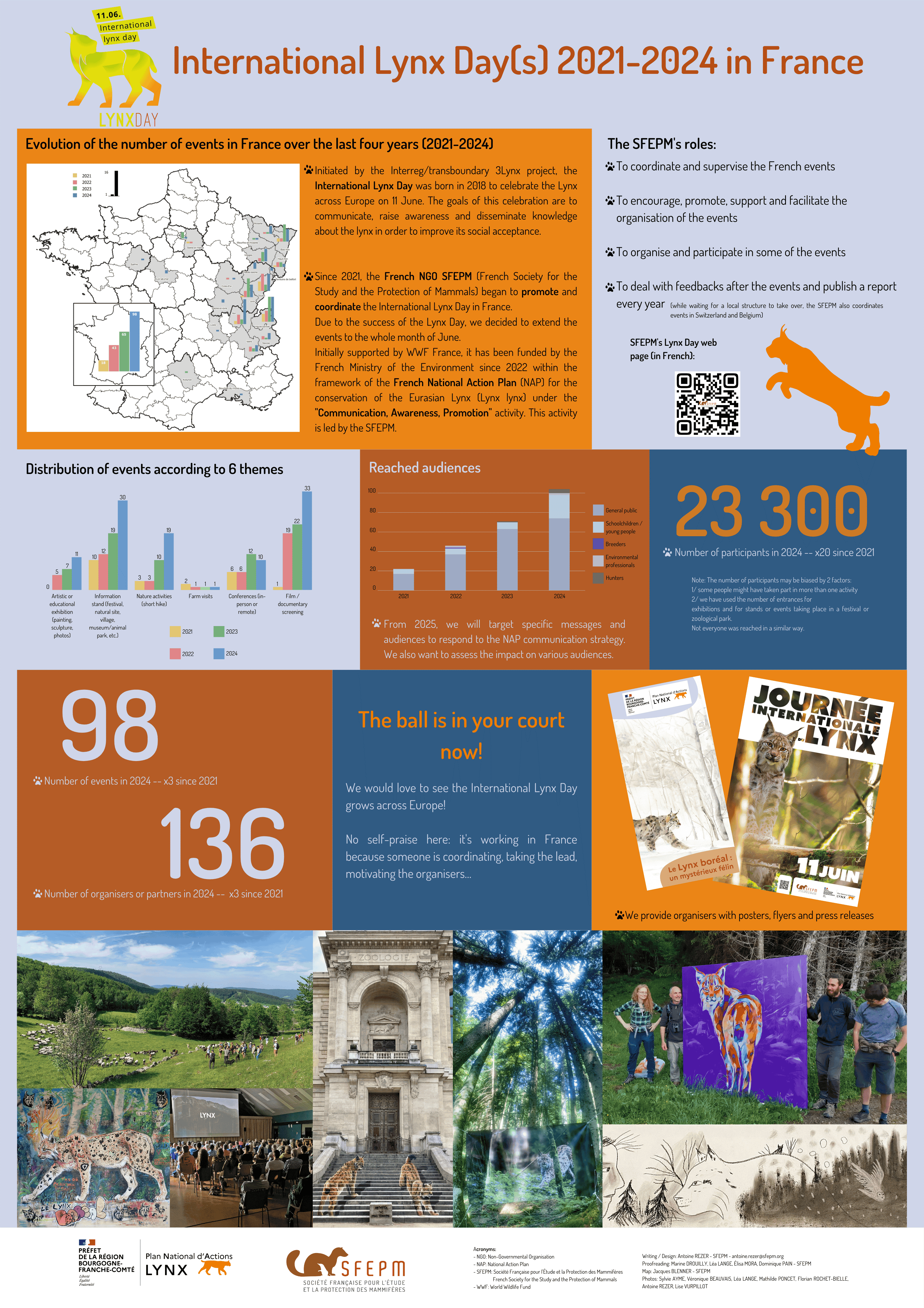 - Ce document présente l'évolution des événements organisés en France dans le cadre de la Journée Internationale du Lynx entre 2021 et 2024. Il inclut des données sur le nombre d'événements, les thèmes abordés, les publics atteints, et les rôles de la SFEPM dans l'organisation et la coordination de ces événements. L'objectif est de sensibiliser le public, améliorer l'acceptation sociale du Lynx et promouvoir sa conservation.
